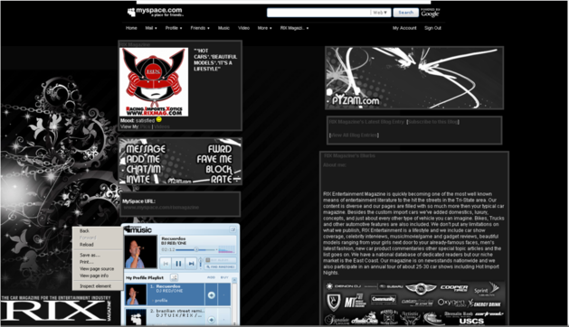 The social networking powerhouse that gives you the opportunity to upload music, pictures, videos, blogs themes...with the endless amount of 3rd party software available and the simple way that it can be updated it can become a showcase for your business. Take a look at RIX Magazines MySpace page:
